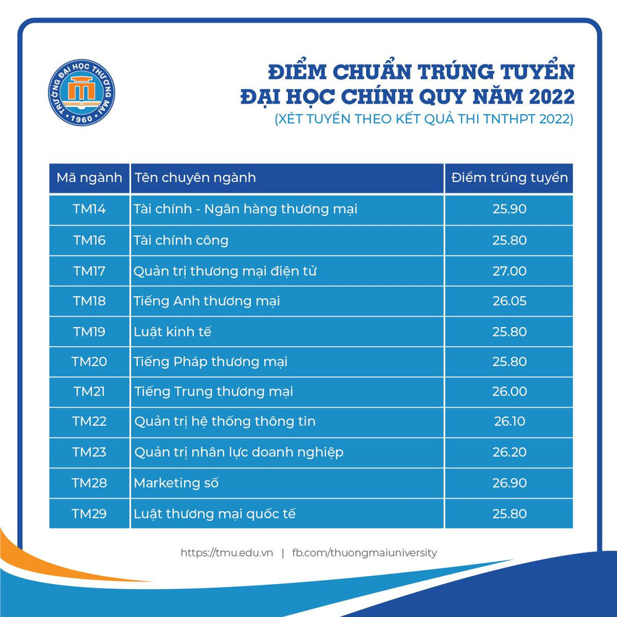 Thí sinh thực hiện nhập học trực tuyến trên hệ thống nhập học của Trường theo địa chỉ: https://nhaphoc.tmu.edu.vn từ ngày 19/9/2022 đến trước 17 giờ 00 ngày 30/9/2022 (theo Hướng dẫn nhập học năm 2022); nộp hồ sơ nhập học (bản cứng) trực tiếp tại Trường từ 3/10 đến 21/10/2022 (theo Kế hoạch số 1173/KH-ĐHTM ngày 14/9/2022 về kế hoạch nhập học đại học chính quy Khóa 58).