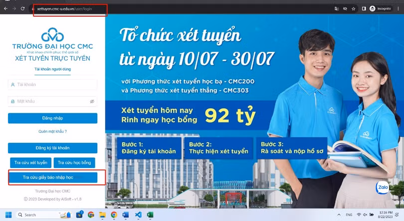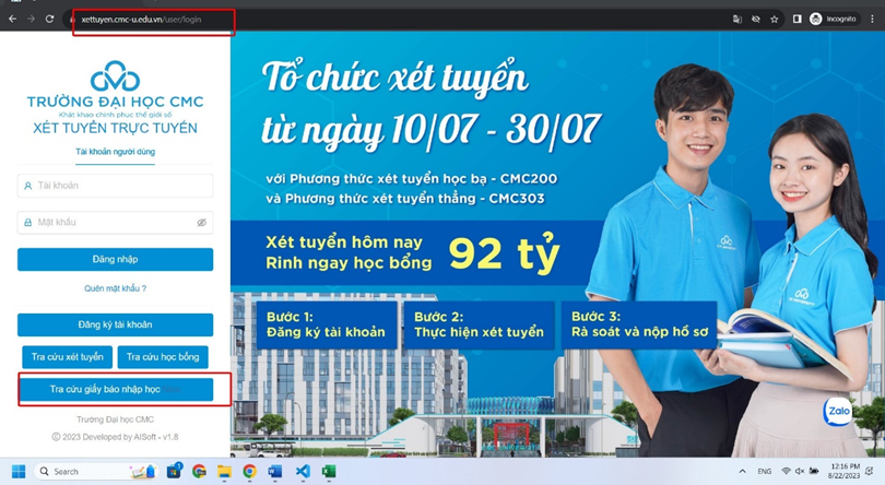 Từ ngày 22/8/2023, thí sinh tra cứu kết quả trúng tuyển Trường ĐH CMC đợt 1 năm 2023 tại website: https://xettuyen.cmc-u.edu.vn/ theo 3 bước hướng dẫn dưới đây: