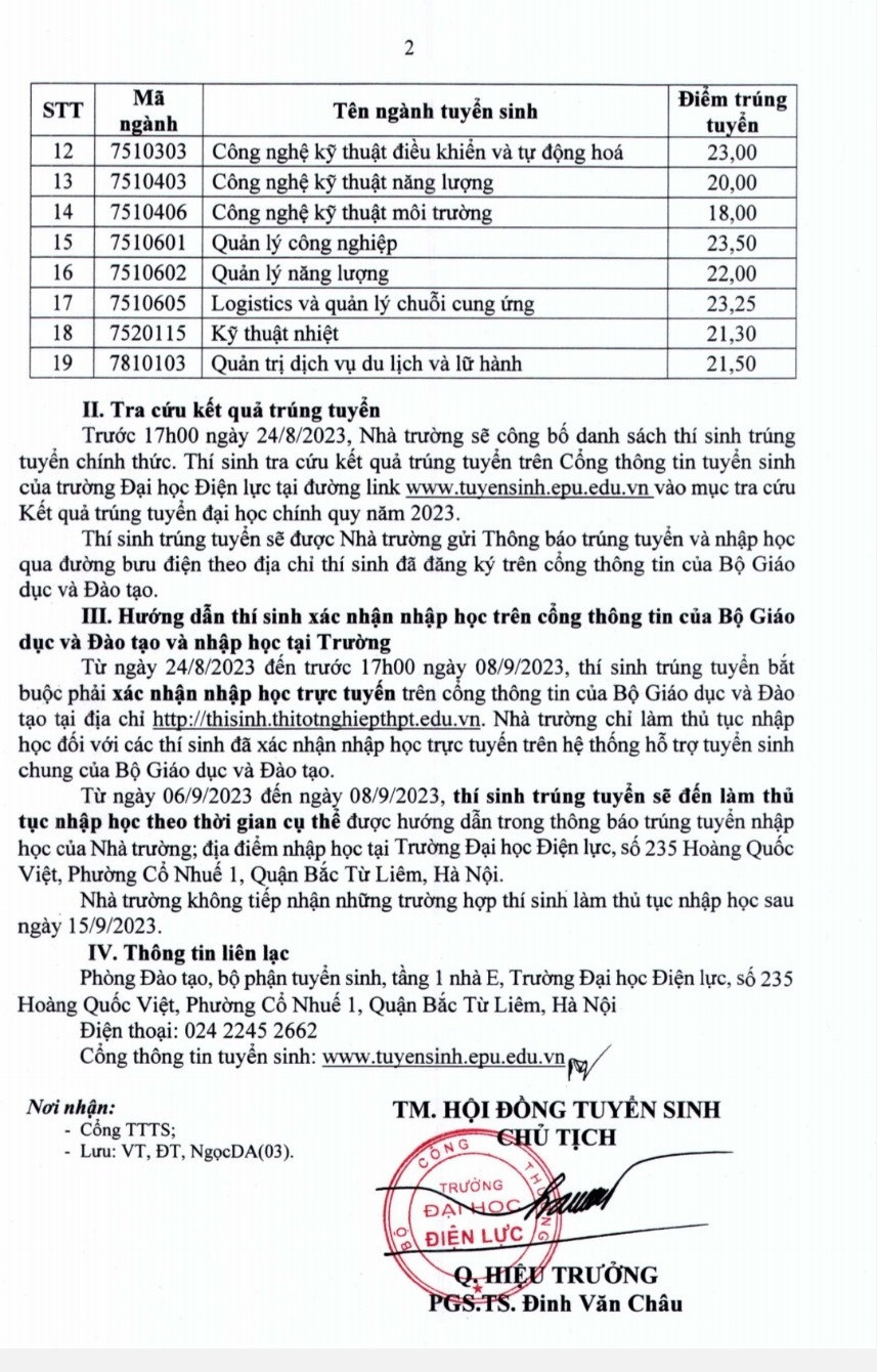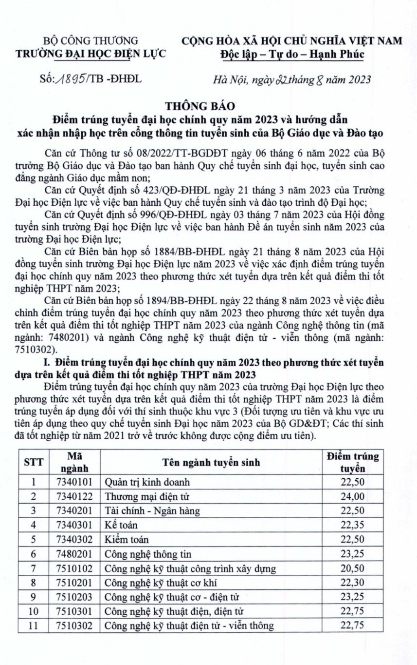 Chiều 22/8, Hội đồng tuyển sinh Trường Đại học Điện lực thông báo điểm trúng tuyển đại học chính quy năm 2023 và hướng dẫn xác nhận nhập học trên cổng thông tin tuyển sinh của Bộ GD&ĐT.