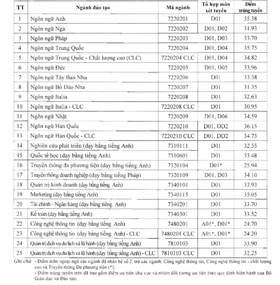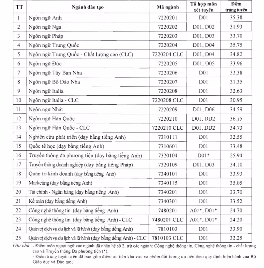 Đứng thứ 2 là ngành Ngôn ngữ Trung Quốc tổ hợp xét tuyển D01, D04 có điểm chuẩn 35,75 điểm. Tiếp đó là ngành Ngôn ngữ Anh tổ hợp D01 có điểm chuẩn 35,38 điểm; ngành Ngôn ngữ Trung Quốc - chất lượng cao điểm chuẩn 34,82 điểm...