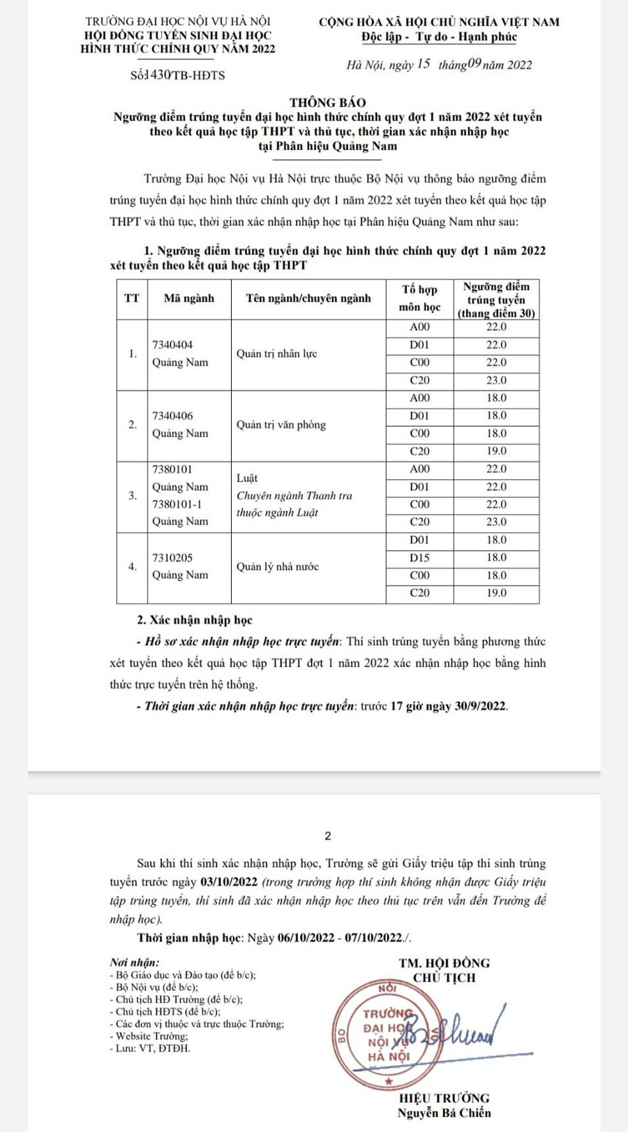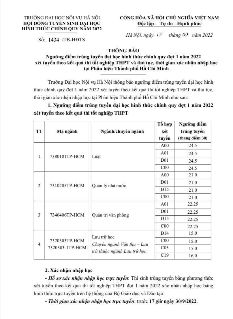 Chiều 15/9, Trường Đại học Nội vụ Hà Nội thông báo điểm trúng tuyển từ 15 đến 27 cho các ngành, đối với điểm trúng tuyển Đại học chính quy theo phương thức xét tuyển kết quả thi Tốt nghiệp THPT năm 2022.