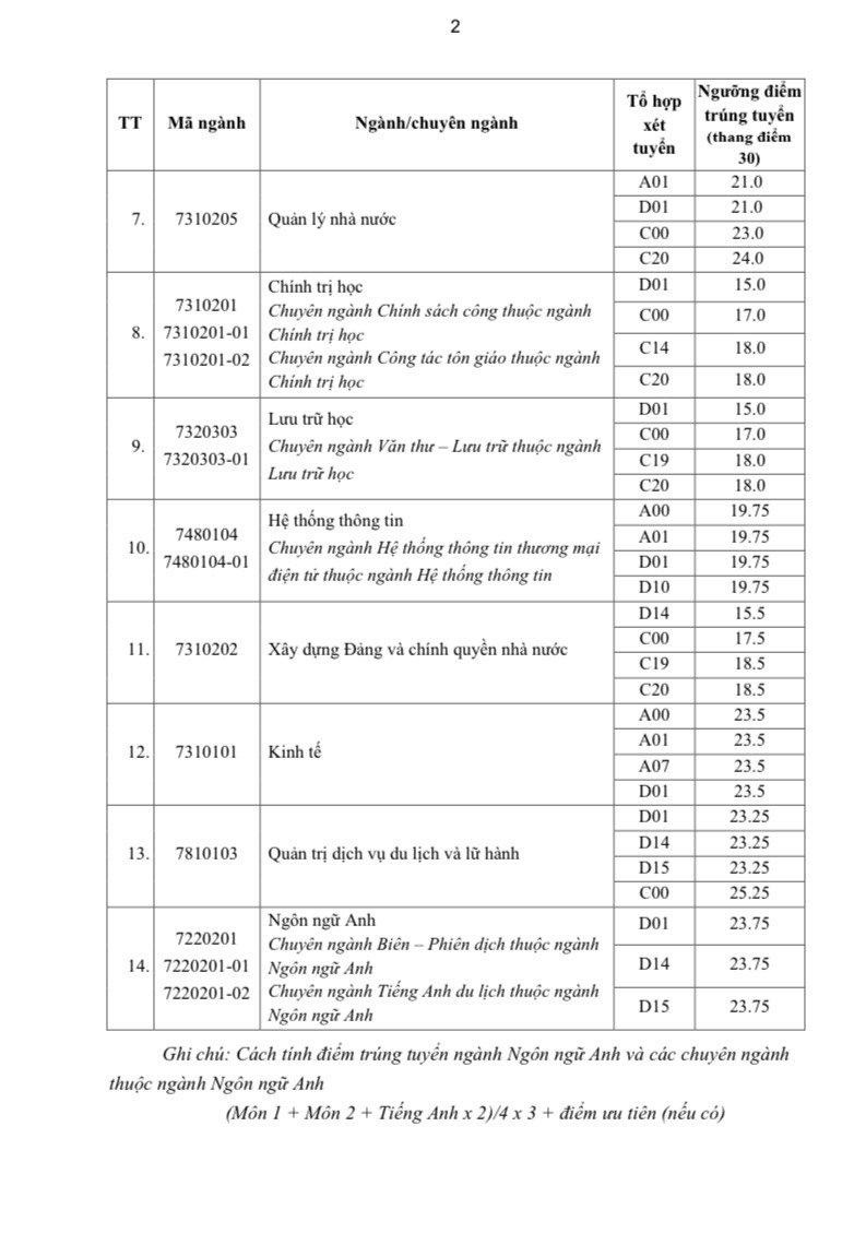 Các ngành như Quản trị dịch vụ du lịch và lữ hành, Quản lý nhà nước, Ngôn ngữ Anh có mức điểm từ 21.25 đến 25.25 điểm. Riêng ngành Kinh tế có mức điểm là 23.5 điểm.