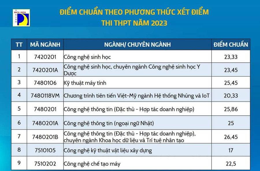 | Điểm trúng tuyển vào các ngành đào tạo theo hình thức sử dụng kết quả thi Tốt nghiệp THPT năm 2023 của Trường ĐH Bách khoa, ĐH Đà Nẵng. |