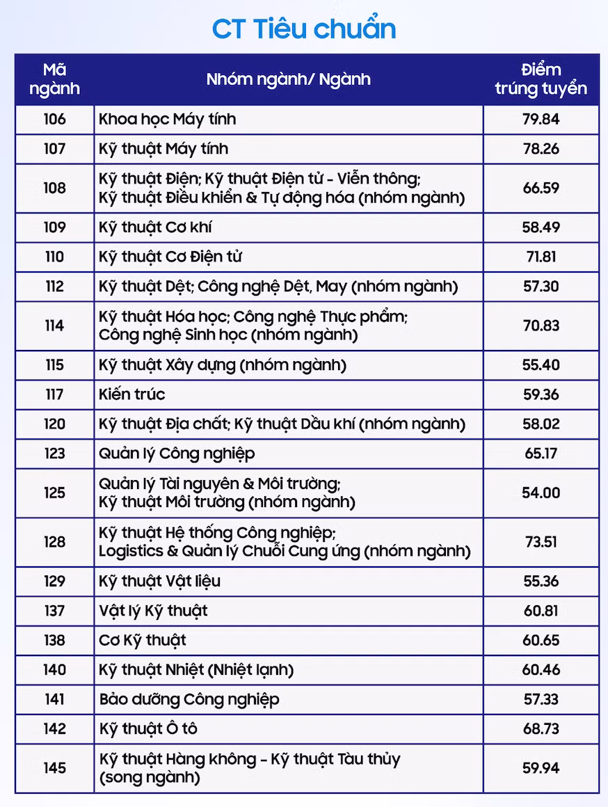 Theo đó, ngành Khoa học máy tính, chương trình tiêu chuẩn, tiếp tục dẫn đầu bảng điểm chuẩn Trường ĐH Bách khoa, ĐH Quốc gia TPHCM với 79,84 điểm. Điểm chuẩn cụ thể từng ngành như sau:
