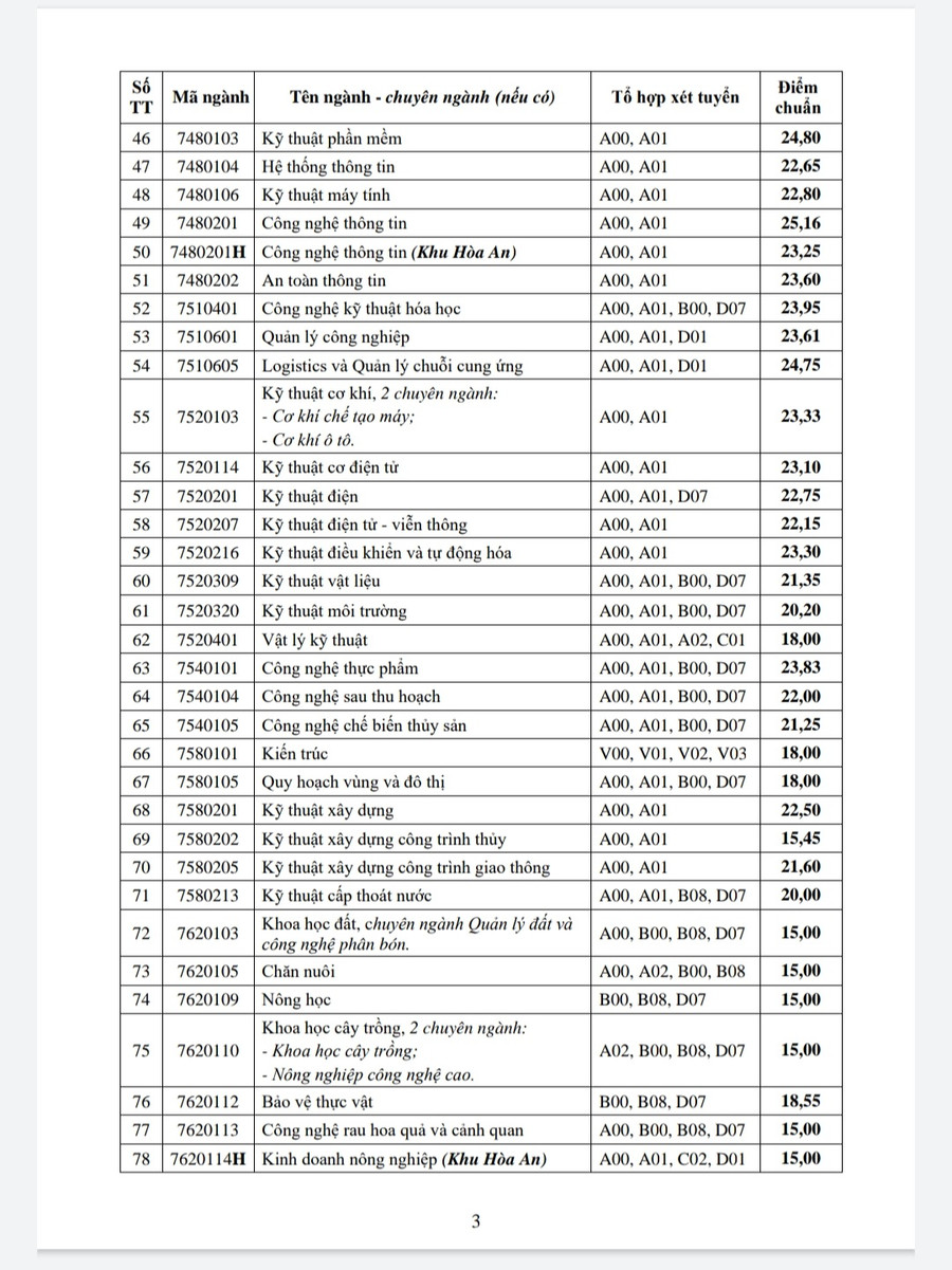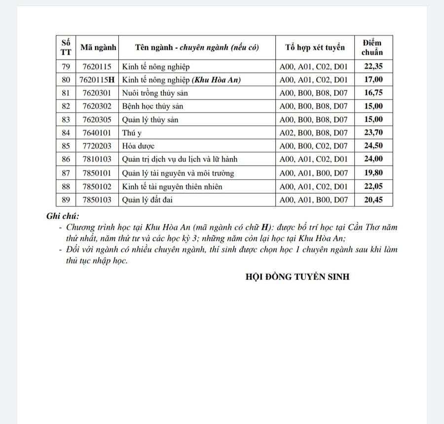 Trường ĐH Cần Thơ lưu ý, chương trình học tại Khu Hòa An, tỉnh Hậu Giang (mã ngành có chữ H): Học tại Cần Thơ năm thứ nhất, năm thứ tư và các học kỳ 3 (học kỳ hè); những năm còn lại học tại Khu Hòa An. Đối với ngành có nhiều chuyên ngành, thí sinh được chọn chuyên ngành để theo học khi nộp hồ sơ nhập học.
