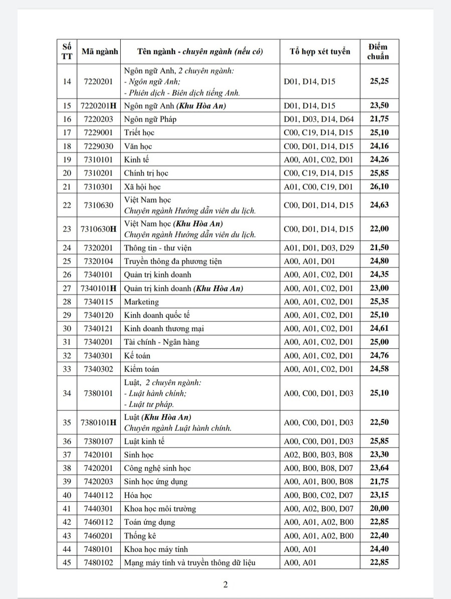Ngành Sư phạm Giáo dục công dân có điểm chuẩn trúng tuyển đại học cao nhất: 26,86 điểm; kế đến các ngành: Sư phạm Lịch sử 26,75 điểm; Sư phạm Ngữ văn 26,63 điểm... Nhóm ngành thuộc lĩnh vực Khoa học xã hội cũng có điểm chuẩn trúng tuyển cao như: Xã hội học 26,10 điểm; Chính trị học 25,85 điểm...