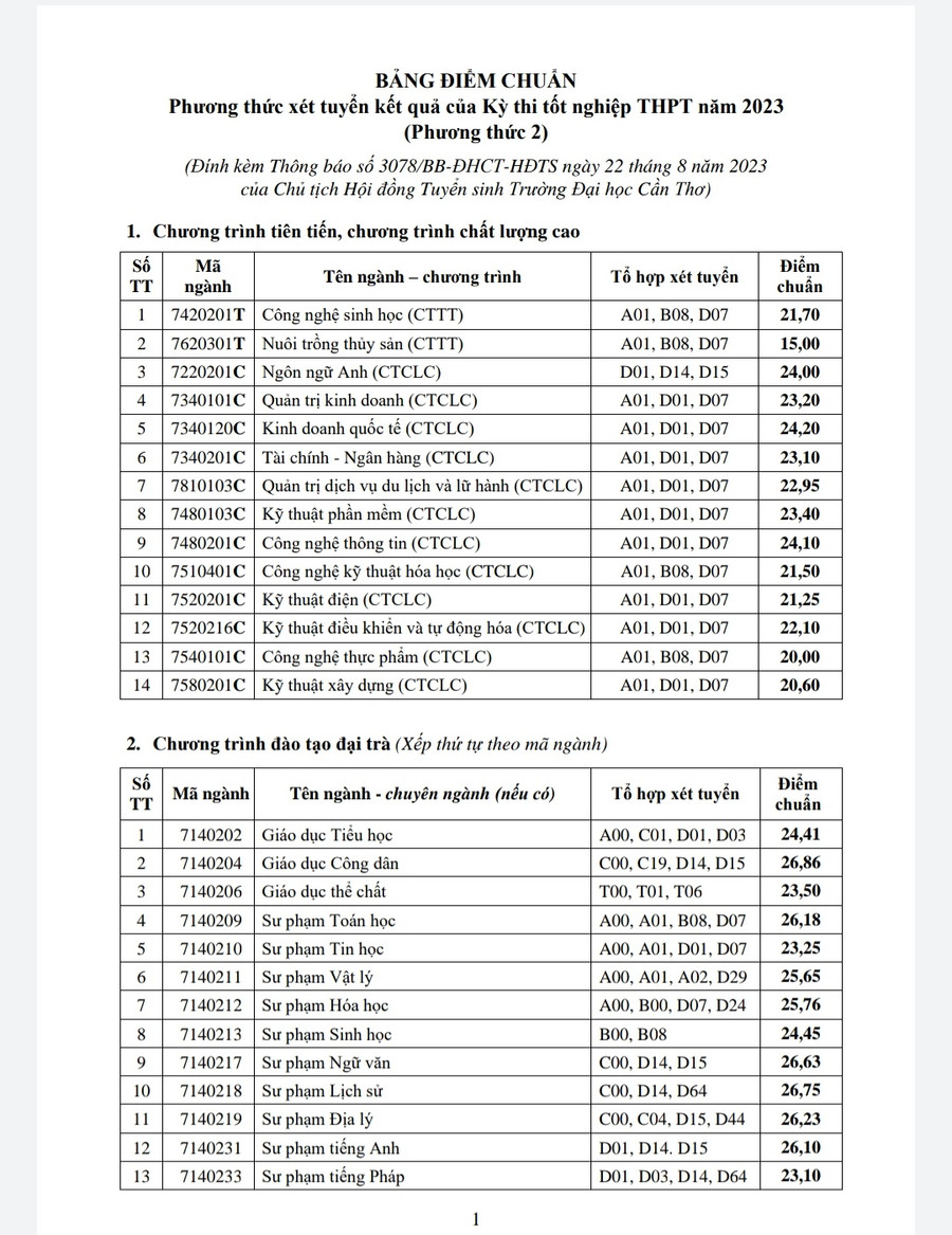 Điểm chuẩn phương thức xét kết quả kỳ thi tốt nghiệp THPT năm 2023 của Trường ĐH Cần Thơ: