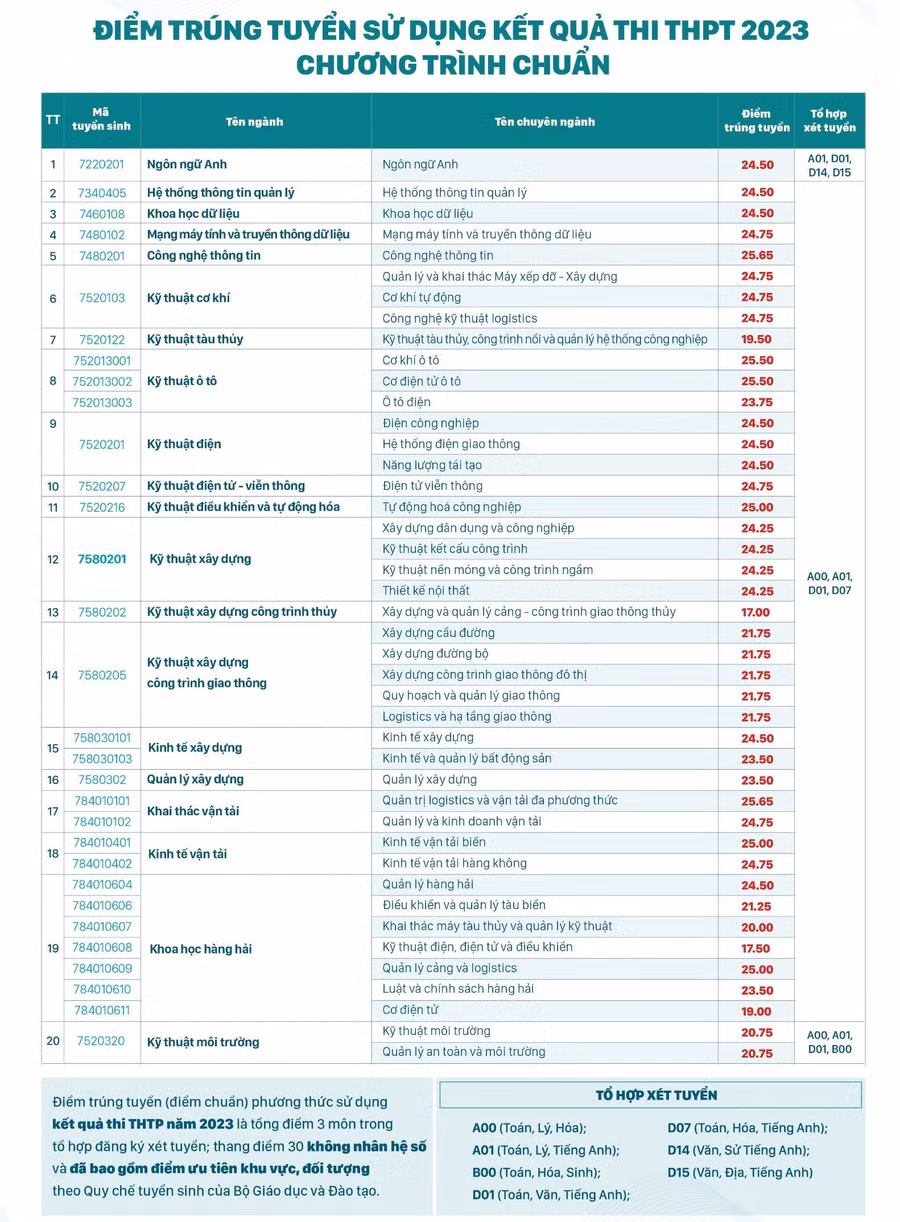 Điểm chuẩn năm nay của trường dao động 17-25,65. Trong đó, ngành Quản trị Logistics và vận tải đa phương thức (chương trình chuẩn) và Logistics và quản lý chuỗi cung ứng (chương trình chất lượng cao), Công nghệ thông tin có điểm chuẩn cao nhất trường 25,65.