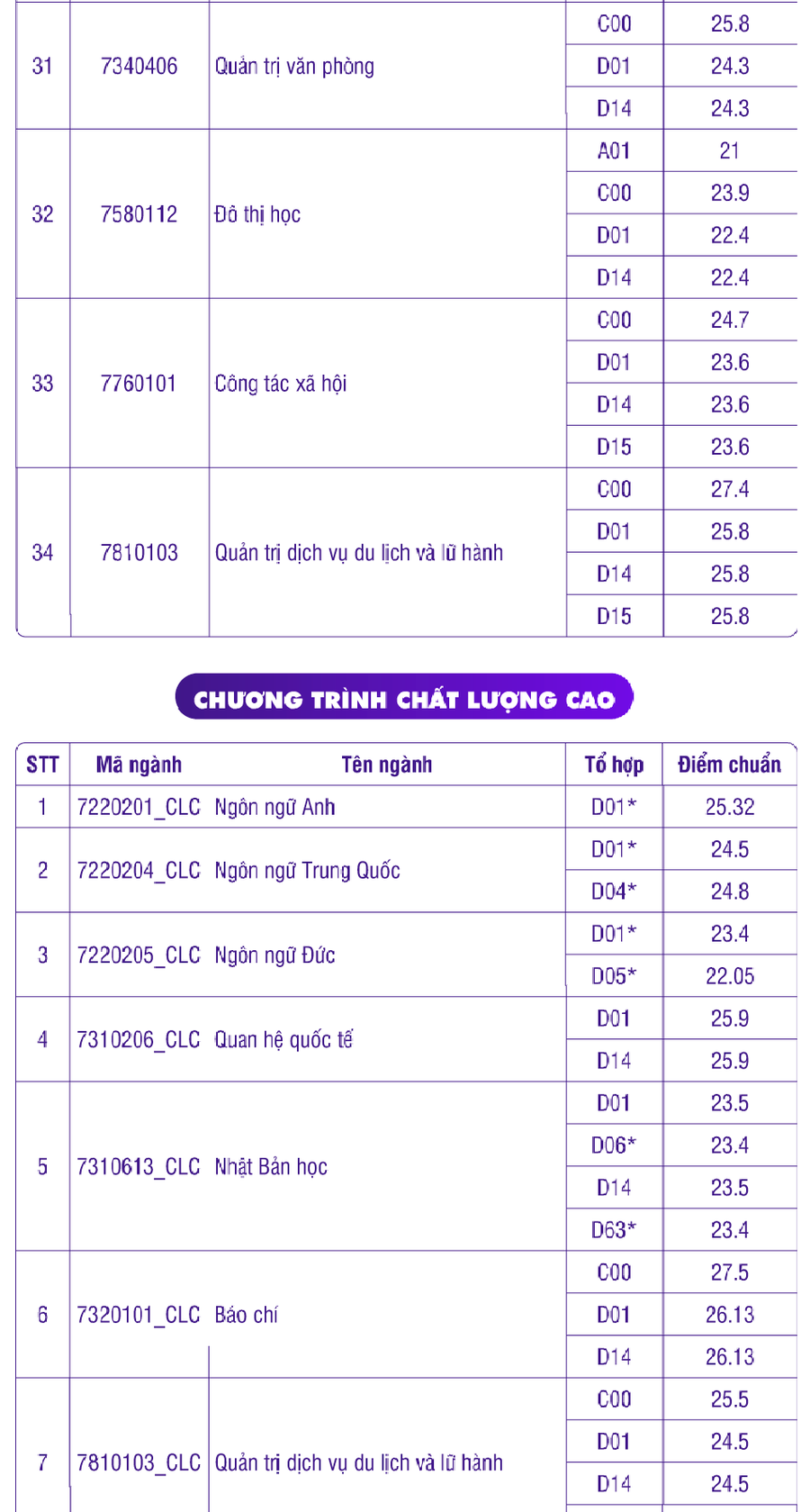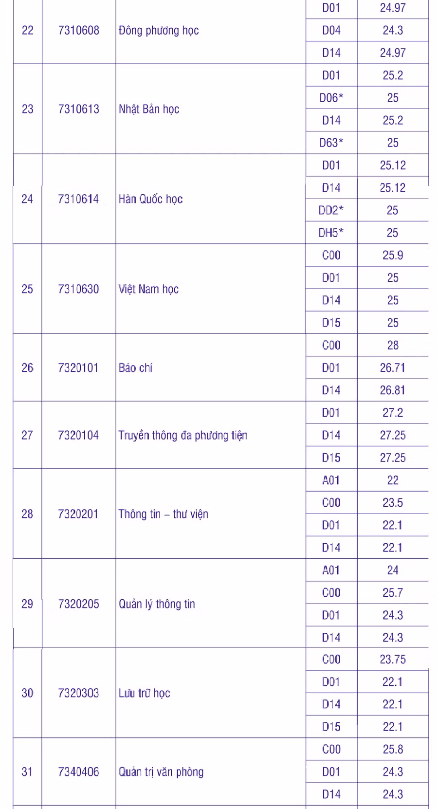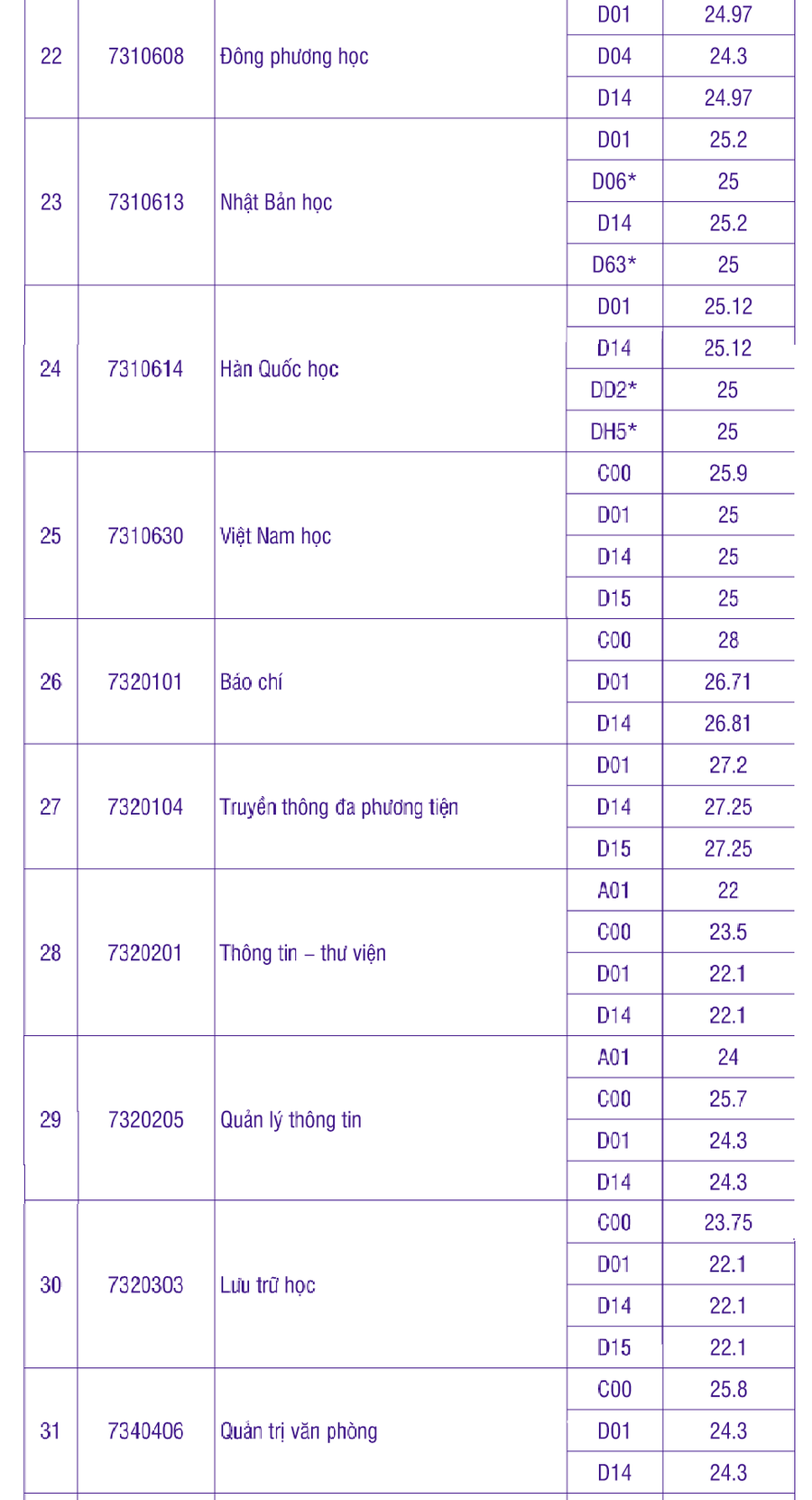 Bên cạnh đó, các ngành có điểm từ 27 trở lên bao gồm: Báo chí Chất lượng cao (C00: 27,5 điểm), Quản trị dịch vụ du lịch và lữ hành (C00: 27,4 điểm), Truyền thông đa phương tiện (D14, D15: 27,25 điểm; D01: 27,02 điểm), Văn học (C00: 27 điểm), Tâm lý học (C00: 27 điểm).