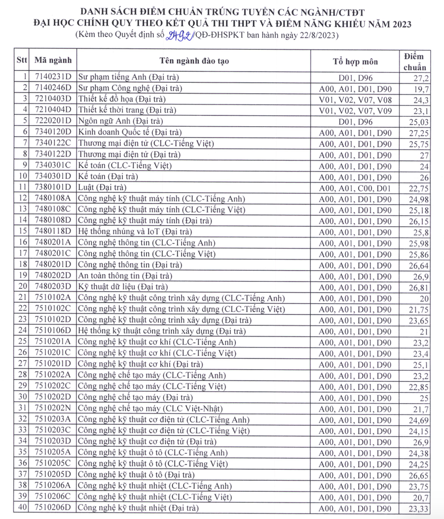 Chiều 22/8, Hội đồng tuyển sinh Trường ĐH Sư phạm Kỹ thuật TPHCM công bố điểm chuẩn trúng tuyển diện xét kết quả thi tốt nghiệp THPT và điểm thi năng khiếu các ngành (chương trình) đào tạo trình độ đại học chính quy hệ đại trà, chất lượng cao tiếng Việt, chất lượng cao tiếng Anh, chất lượng cao Việt - Nhật.