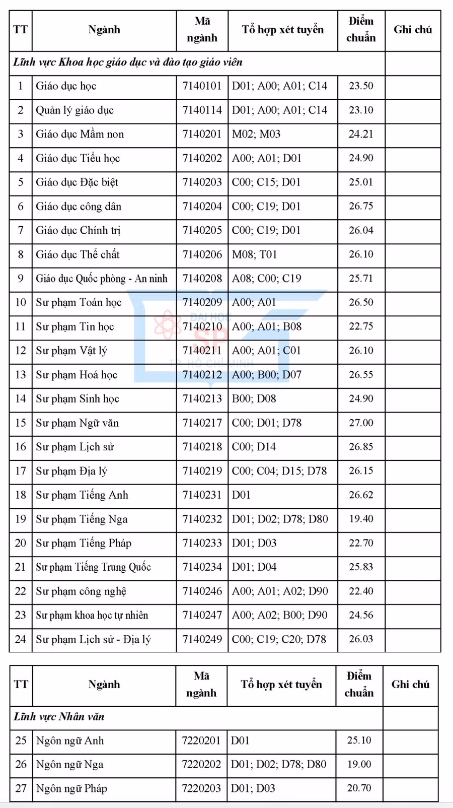 Theo đó, 3 ngành Sư phạm Ngữ văn, Sư phạm Lịch sử và Giáo dục Công dân có điểm chuẩn cao nhất với mức điểm từ 26,75 điểm trở lên. Cả 3 ngành đều là khối ngành đạo tạo hệ sư phạm của trường, thuộc các ngành học về khoa học xã hội.