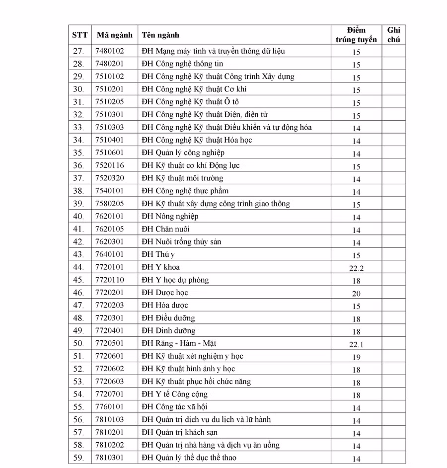 Các ngành khối sức khỏe điểm chuẩn cao nhất, cụ thể, ngành Y khoa 22,2 điểm; Răng - Hàm - Mặt 22,1; Dược học 20; Kỹ thuật xét nghiệm y học 19; Y học dự phòng, Điều dưỡng, Dinh dưỡng, Kỹ thuật hình ảnh y học, Kỹ thuật phục hồi chức năng, Y tế công cộng là 18 điểm; Hóa dược 15.