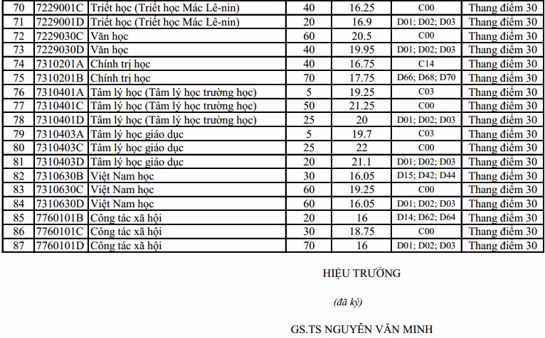 Giống như mọi năm, nhiều ngành ngoài sư phạm có điểm chuẩn thấp, chỉ 16-17 điểm, như ngành Công tác xã hội, Sinh học, Triết học hay Việt Nam học.