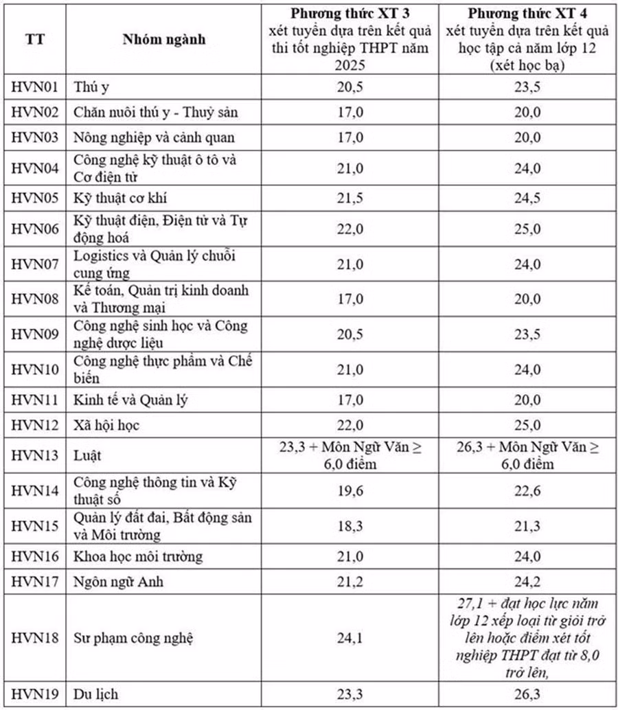 Ngày 22/8, Học viện Nông nghiệp Việt Nam công bố điểm chuẩn trúng tuyển đại học chính quy năm 2025 đối với phức thức xét tuyển dựa trên kết quả thi tốt nghiệp THPT và xét tuyển dựa trên kết quả học tập bậc THPT (Xét học bạ).
