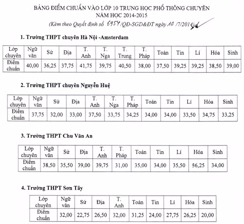 Trước đó, Sở GD&ĐT Hà Nội cũng đã công bố điểm xét tuyển vào lớp 10 THPT năm học 2014 - 2015.