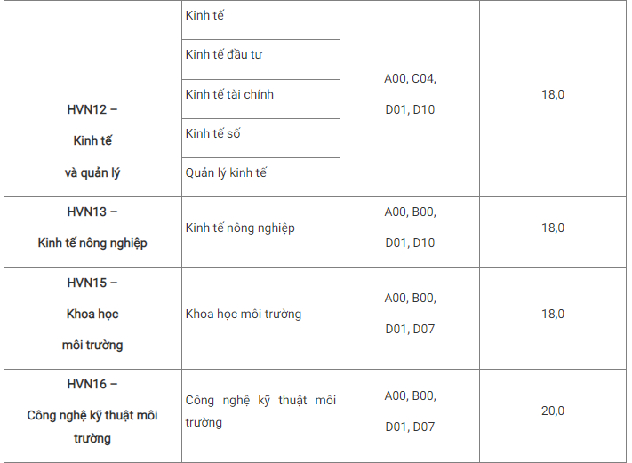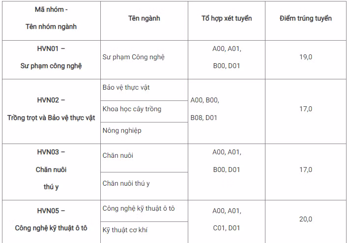 Đối với phương thức xét tuyển theo kết quả thi tốt nghiệp THPT năm 2022 của Học viện Nông nghiệp Việt Nam, mức điểm cao nhất là 23 - ngành Khoa học đất, thấp nhất là 17 - các ngành như Trồng trọt và Bảo vệ thực vật; Chăn nuôi, thú y; Công nghệ sinh học...
