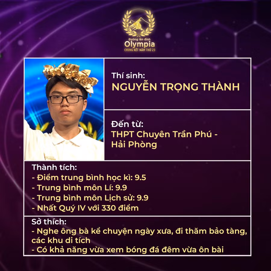 Nguyễn Trọng Thành, học sinh lớp 12 chuyên Anh, Trường THPT chuyên Trần Phú, Hải Phòng là thí sinh cuối cùng ghi danh vào chung kết Olympia 23. Thành là người có điểm số phần thi Về đích cao nhất năm nay với 150 điểm, cũng là thí sinh có điểm thi quý cao nhất trong 4 thí sinh dự chung kết