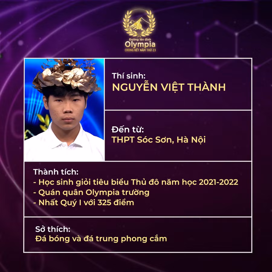 Hành trình chinh phục Olympia 23, Việt Thành ghi dấu ấn với những chiến thắng áp đảo. Cụ thể, Thành vượt qua trận tuần với 280 điểm (hơn người về nhì hơn 100 điểm); cán đích trận tháng với 310 điểm (hơn người về nhì 145 điểm); giành vòng nguyệt quế trận quý với 325 điểm (bỏ xa người về nhì, hơn 200 điểm).