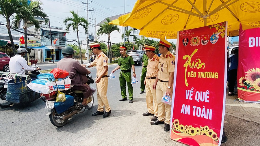 Chi đoàn Phòng Cảnh sát giao thông (Công an tỉnh An Giang) phối hợp Ban Thanh niên, Ban Phụ nữ - Công đoàn Công an tỉnh và Phường Đoàn phường Mỹ Thạnh, TP Long Xuyên tổ chức “Điểm dừng chân nghĩa tình” xuân Giáp Thìn năm 2024 trên tuyến Quốc lộ 91 (phường Mỹ Thạnh, TP Long Xuyên) nhằm tiếp sức người dân trên đường về quê đón Tết.