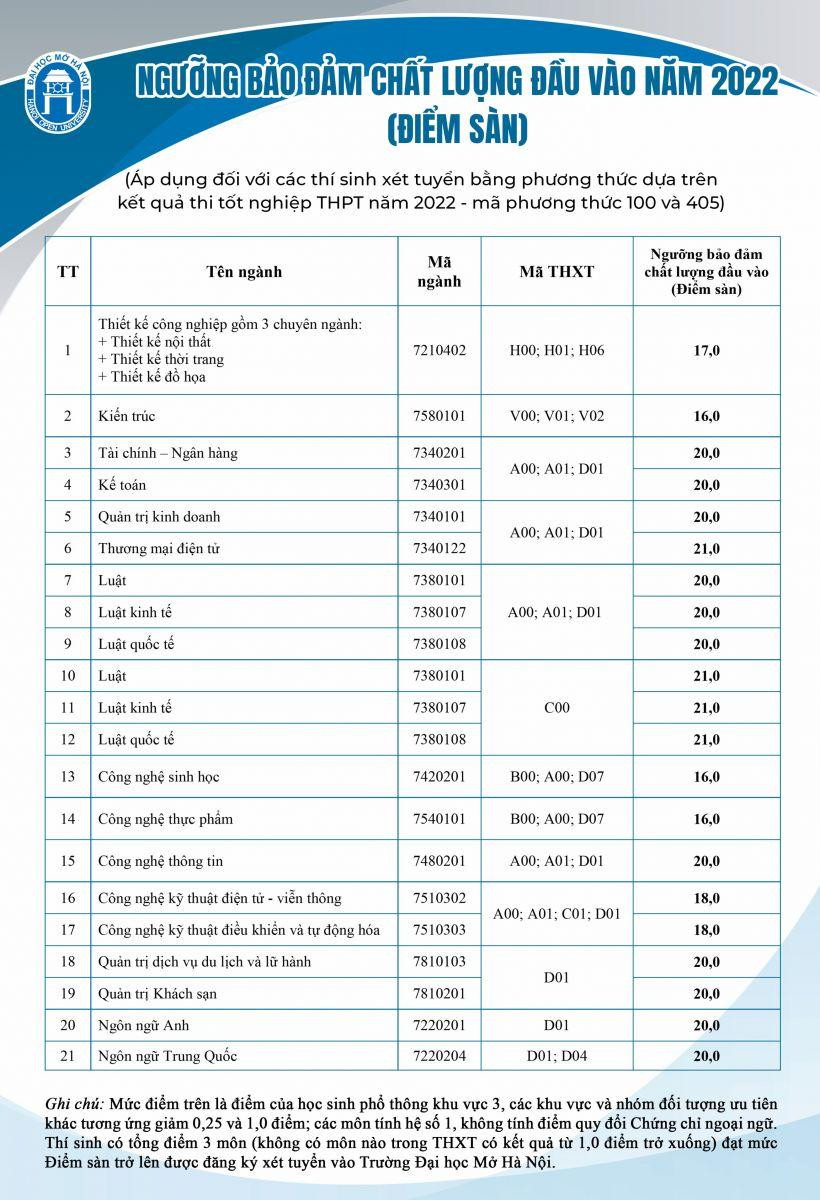 Theo đó, mức điểm sàn xét tuyển của Trường ĐH Mở Hà Nội năm 2022 có tăng nhẹ so với năm 2021. Có 3 ngành nhận hồ sơ từ 16 điểm trở lên, còn lại đa số các ngành có “điểm sàn” là: 20, 21 điểm, đảm bảo đáp ứng tốt chương trình đào tạo theo hướng ứng dụng của Nhà trường.