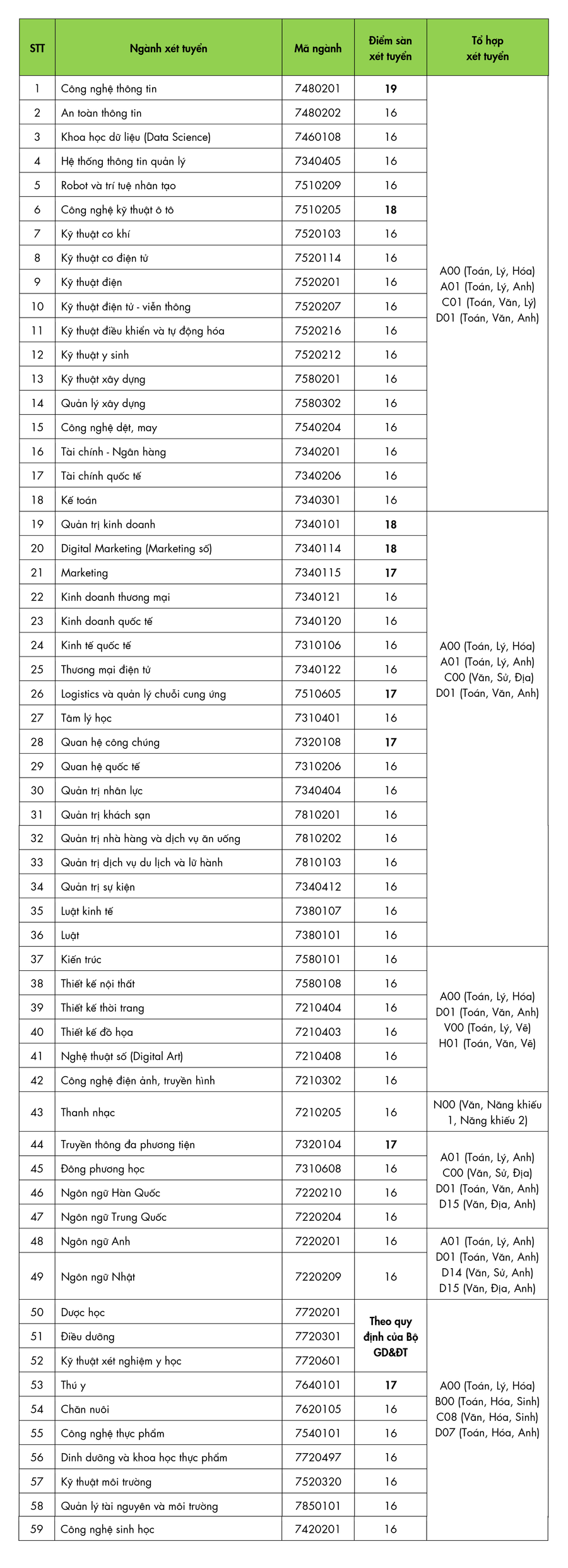 Đây cũng là những ngành có điểm trúng tuyển cao nhất theo các phương thức xét tuyển sớm đã được công bố trước đó. Tất cả các ngành còn lại có mức điểm sàn xét tuyển từ 16 điểm.