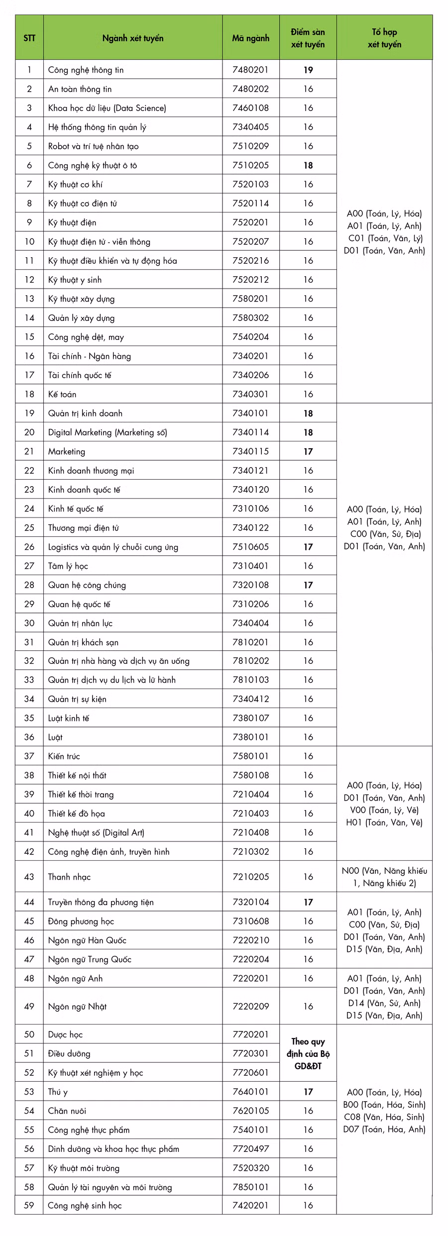 Kế đó là các ngành Công nghệ kỹ thuật ô tô, Quản trị kinh doanh và Digital Marketing có điểm sàn là 18 điểm.