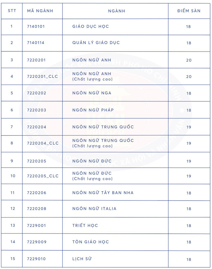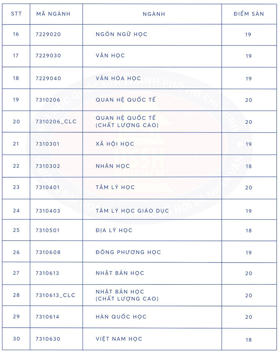| Điểm sàn các ngành đào tạo tại Trường ĐH Khoa học Xã hội và Nhân văn TPHCM. Ảnh: HCMUSSH |