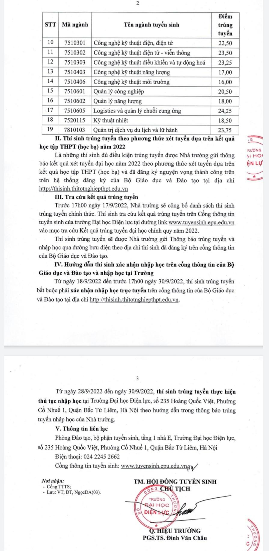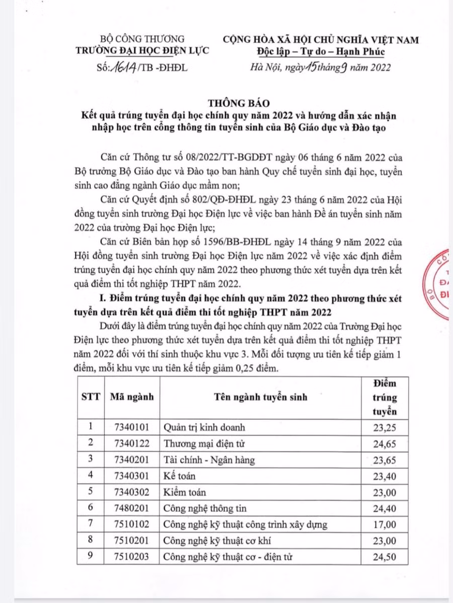 Chiều 15/9, Hội đồng tuyển sinh Trường Đại học Điện lực thông báo điểm trúng tuyển đại học chính quy năm 2022 và hướng dẫn xác nhận nhập học trên cổng thông tin tuyển sinh của Bộ GD&ĐT.