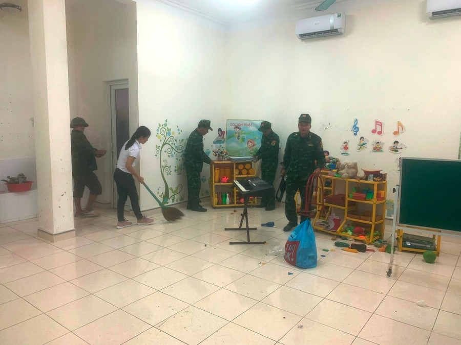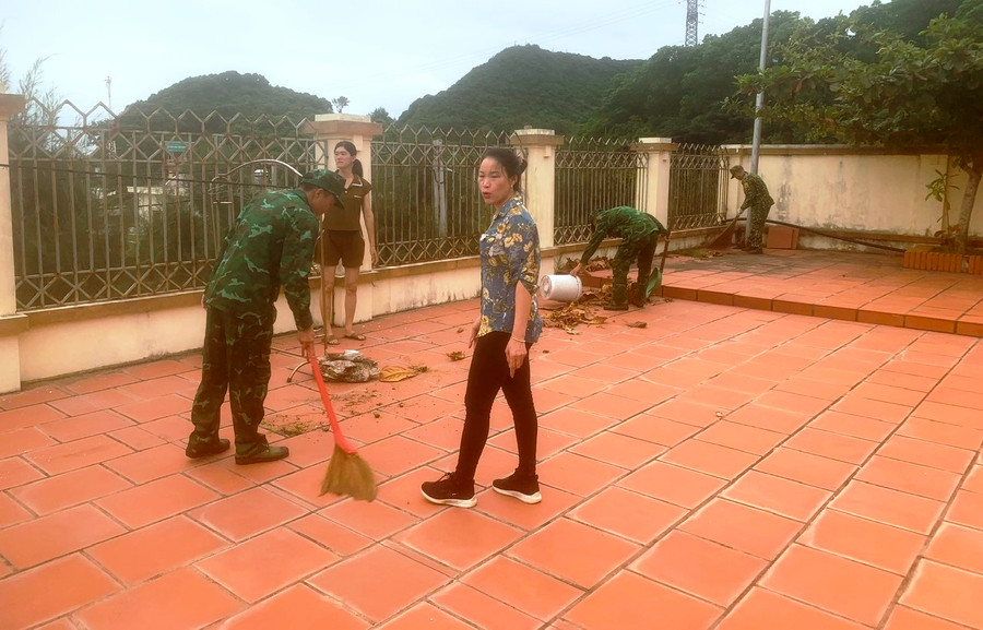 | Người dân và các bộ chiến sỹ dọn dẹp khuôn viên trường. |