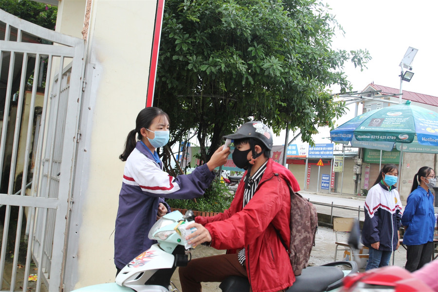 Ghi nhận của Báo GD&TĐ, từ 5 giờ 30 sáng, cán bộ làm thi và đội ngũ thanh niên tình nguyện của trường THPT huyện Điện Biên đã có mặt làm công tác chuẩn bị đón thí sinh. Họ chuẩn bị nước uống, sữa, khẩu trang, hóa chất sát khuẩn để cấp miễn phí cho thí sinh dự thi.