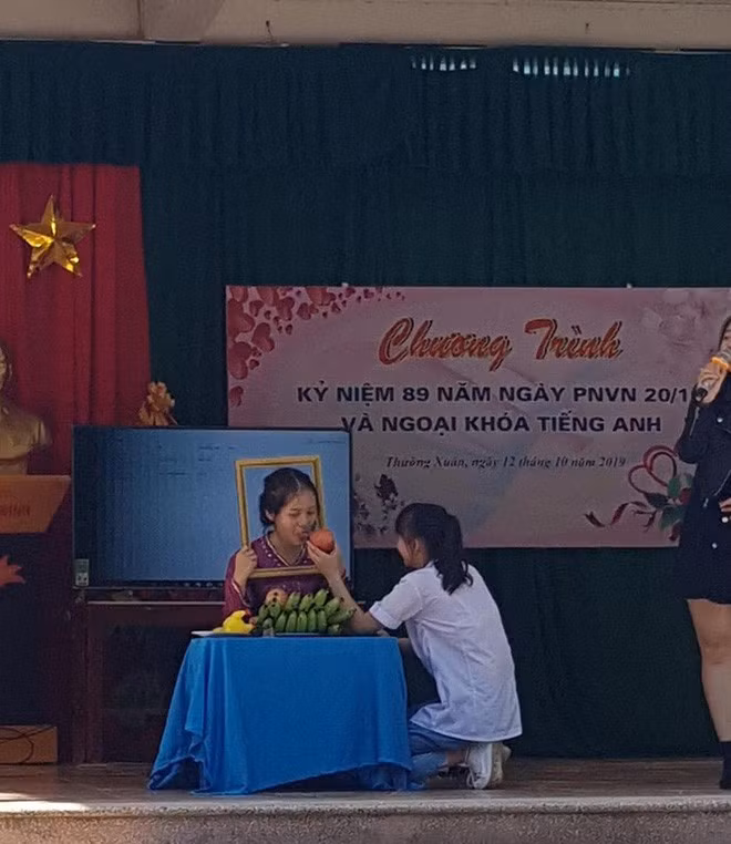 Cụ thể theo những gì cô bạn Phạm Thùy Chi - chủ nhân của bài đăng chia sẻ, đây là một khoảnh khắc nằm trong chương trình kỷ niệm 69 năm ngày Phụ nữ Việt Nam 20/10 và ngoại khóa tiếng Anh do trường THPT Cầm Bá Thước (Thường Xuân, Thanh Hóa) tổ chức.