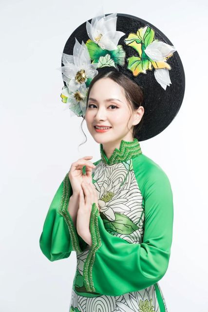 Diễn viên Lan Phương mặc áo dài truyền thống kết hợp với mấn. Trông bà mà một con không những xinh đẹp mà còn được khán giả nhận xét giống với diễn viên Bảo Thanh như chị em sinh đôi.