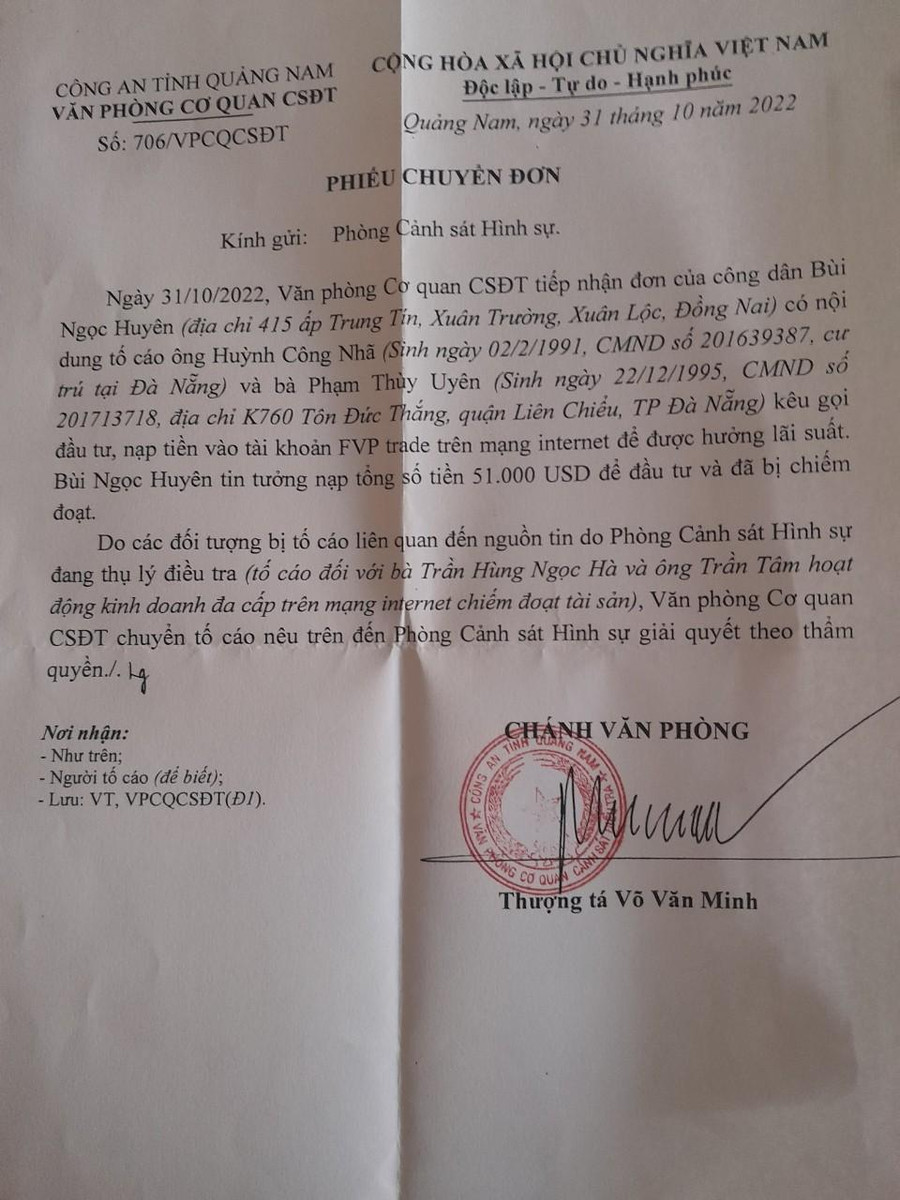 Tại Quảng Nam, văn phòng cơ quan cảnh sát điều tra đã chuyển đơn tố cáo của nạn nhân sàn FVP Trade về phòng Cảnh sát hình sự.