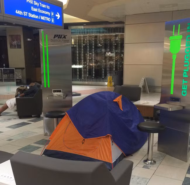 Khi bạn phải ở lại sân bay qua đêm mà lại mang theo lều thì đây là một ý tưởng tuyệt vời.