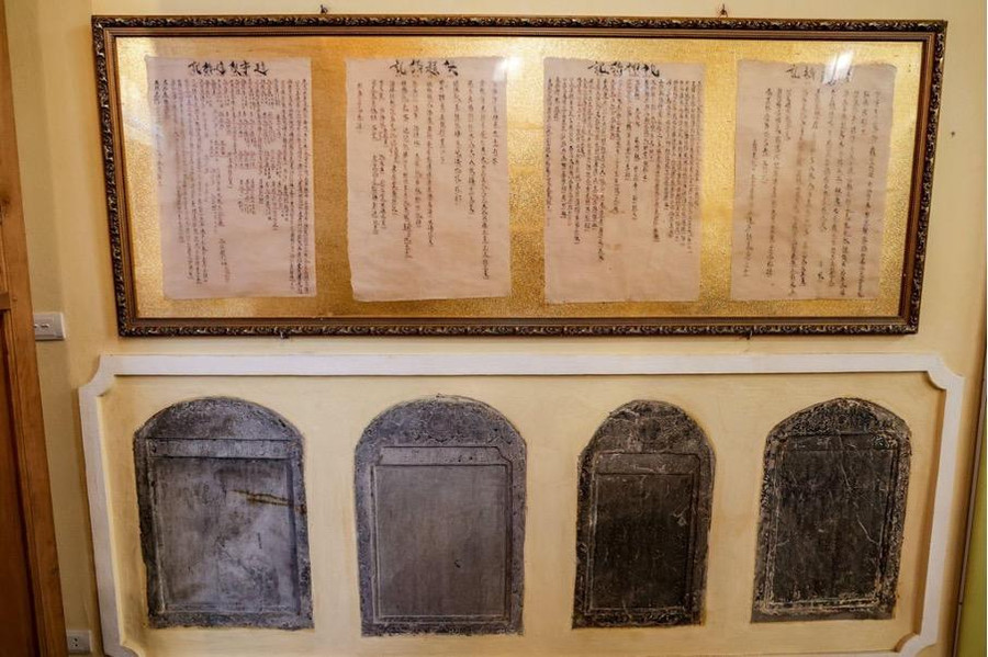 | Ông Nguyễn Mạnh Linh, Chủ tịch UBND phường Hàng Gai giới thiệu về các tấm bia đá cổ đang được bảo tồn tại Đình Cổ Vũ. |
