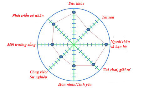 Bánh xe này chia cuộc sống của bạn thành 8 lĩnh vực chính, hiển thị xung quanh đường viền bánh xe. Đường thẳng nối từ mỗi lĩnh vực đến tâm vòng tròn được chia thành 10 bậc.