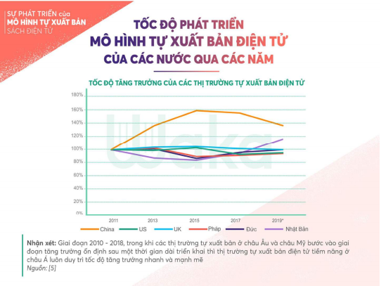 Theo Báo cáo thị trường sách điện tử - Quý IV/2018 và Quý I/2019 – “Sự phát triển của mô hình tự xuất bản điện tử” của Nền tảng xuất bản điện tử Waka, sau một thời gian dài triển khai, thị trường tự xuất bản sách điện tử châu u và châu Mỹ bước vào giai đoạn tăng trưởng ổn định. Trong khi đó, vào giai đoạn 2010 - 2018, châu Á là thị trường tiềm năng đang có tốc độ tăng trưởng nhanh và mạnh mẽ. Nổi bật nhất ở châu Á chính là thị trường tự xuất bản điện tử Trung Quốc với tốc độ tăng trưởng luôn nằm trong top đầu thế giới.