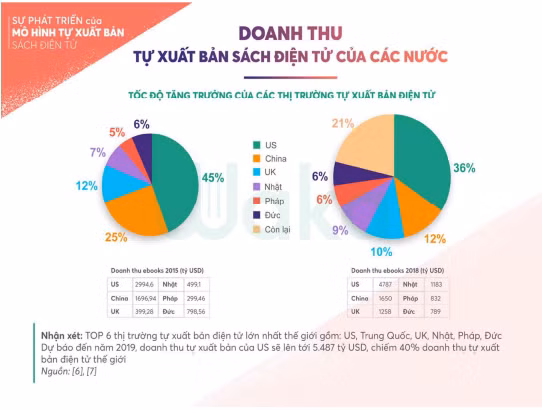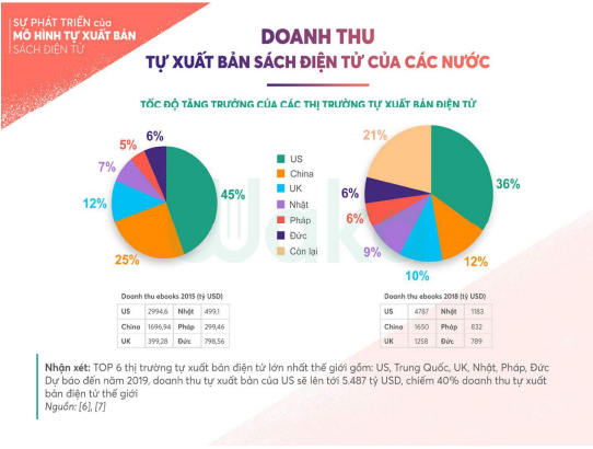 Cũng theo báo cáo của Waka, có thể thấy trong năm 2015, doanh thu thị trường sách điện tử chia đều cho các nước Top 6. Tuy nhiên, đến năm 2018, mặc dù các nước top 6 đều có doanh thu tăng trưởng ấn tượng, xong một nhóm thị trường mới nổi đã xuất hiện trên biểu đồ doanh thu. Chiếm tới 21% trên tổng số doanh thu toàn thế giới, nhóm mới này hứa hẹn một tương lai đầy tiềm năng cho sự phát triển mạnh mẽ của mô hình tự xuất bản điện tử.