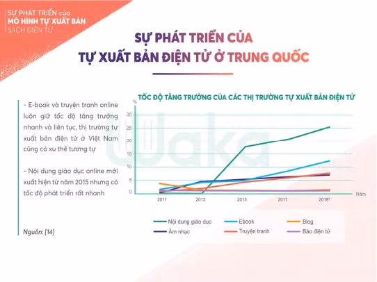 Báo cáo của Waka cho thấy nội dung tự xuất bản điện tử ở Trung Quốc rất đa dạng với sách điện tử, truyện tranh online, nội dung giáo dục, báo điện tử, blog, nhạc, tạp chí. Trong đó, ebook và truyện tranh online luôn giữ tốc độ tăng trưởng nhanh và liên tục. Nội dung giáo dục online chỉ xuất hiện từ năm 2015 song đã có một bước tăng trưởng ấn tượng.