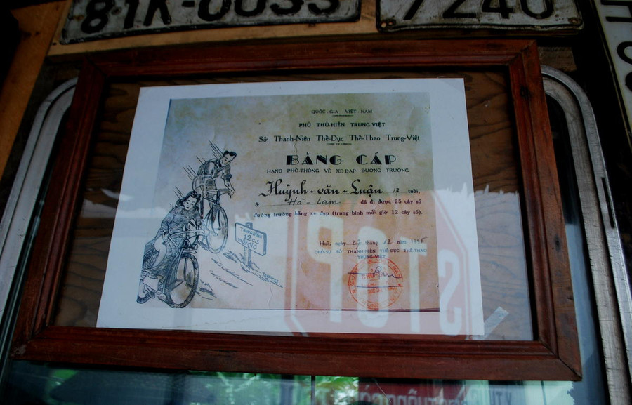 Quầy chế biến cà phê cũng lắp ráp từ cửa kính ôtô, được đính các biển số xe đã bị tai nạn và nơi đây còn trưng bày “bằng lái xe đạp”, loại “bằng” đầu tiên nước ta được ký năm 1955. Ngay cả trong nhà vệ sinh của quán cà phê này cũng được gắn biển cấm rẽ phải, cấm rẽ trái.