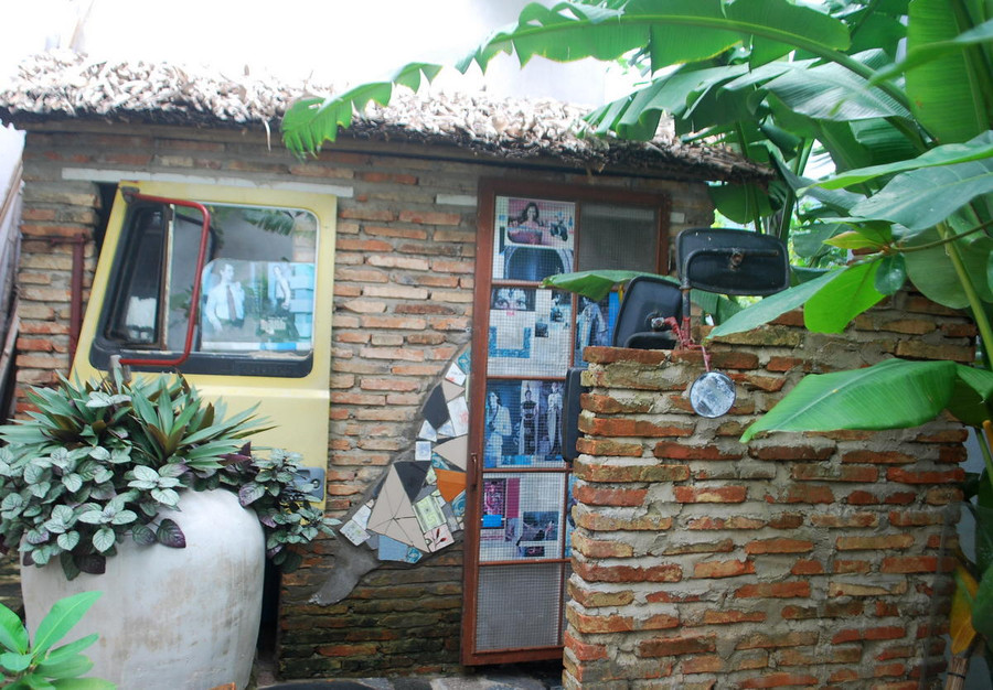 Ngay giữa khu vườn, hàng chục chiếc loa còi bị “nhốt” trong khung sắt, chủ quán bảo đấy tượng trưng cho những chiếc còi bị bỏ trong lồng. Các bộ phận của các loại phương tiện để thiết kế nội, ngoại thất độc đáo. Ghế trệt được làm từ lốp ô tô, ghế cao làm bằng khung xe, chỗ bỏ chân là bàn đạp, mặt bàn là vô lăng…