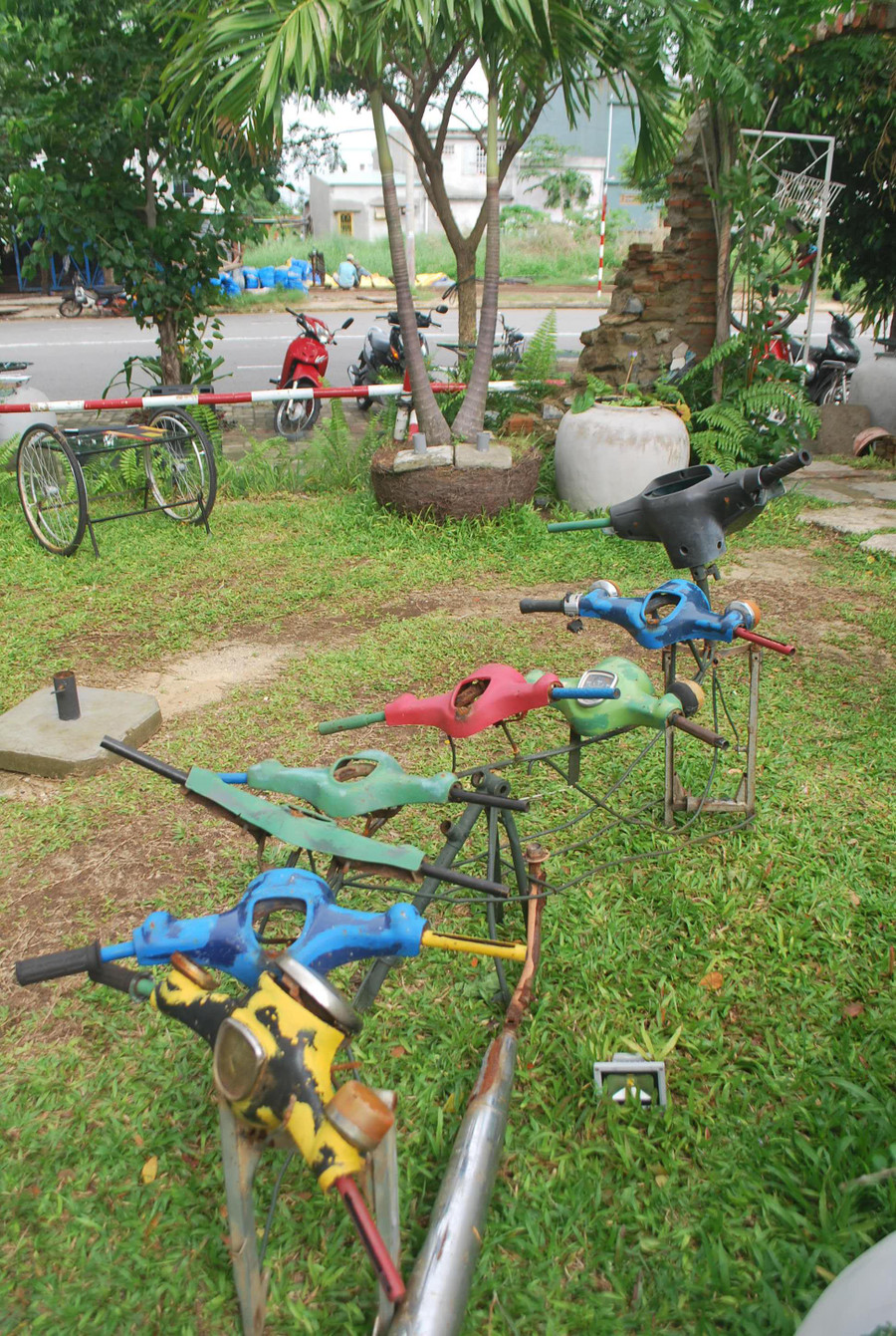Là cảm nhận đầu tiên khi đến quán cà phê “An toàn giao thông” của nghệ sĩ nhiếp ảnh Nguyễn Văn Mỹ (nghệ danh Mỹ Dung), tọa lạc ở lô 21-22 đường Trần Nhân Tông (Q. Sơn Trà, TP Đà Nẵng). Từ ngoài cổng cho đến khu vườn và cả nội thất trưng bày đầy đủ các loại biển báo giao thông, cùng với nhiều phụ tùng, linh kiện các phương tiện được “biến tấu” nghệ thuật làm cho không gian nơi đây thêm phần sinh động, lạ lẫm.