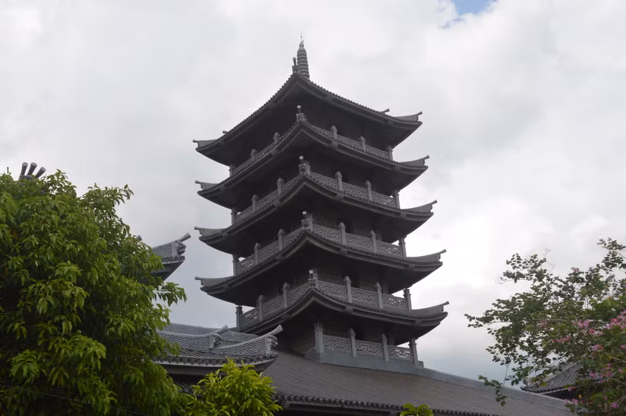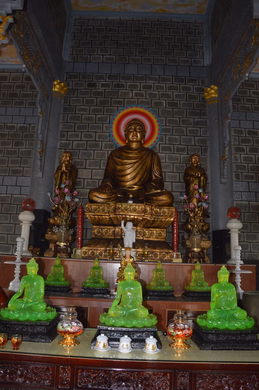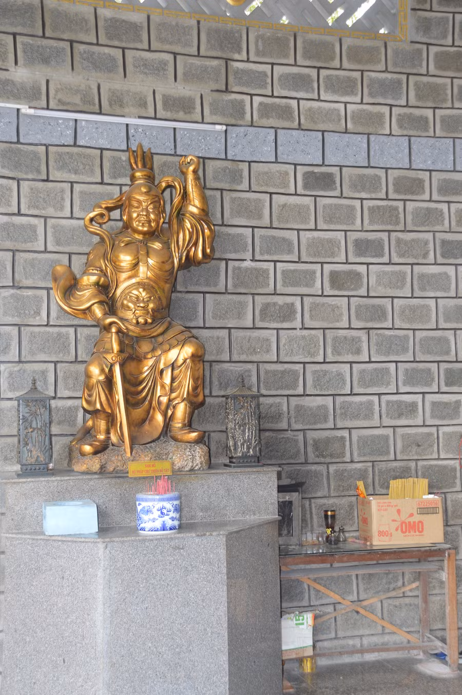 Bước qua các bậc thềm sẽ vào không gian tiền sảnh để đón tiếp khách, 2 bên có tượng hộ pháp canh giữ. Tiếp theo là ngôi chánh điện có không gian rộng lớn được bao bọc bởi những tảng đá nguyên khối xếp chồng lên nhau, giữ nguyên màu sắc tự nhiên, phía trên mỗi góc mái được trang trí hình hổ phù đặc trưng theo họa tiết hoa văn của Nhật Bản.