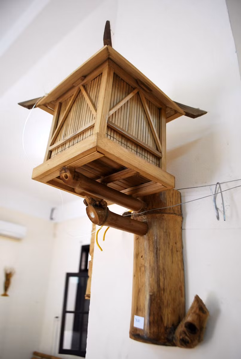 “Nguyên liệu dùng để chế tác là các loại tre đặc, không gãy ngọn mà đích thân tôi lặn lội về các miền quê của Điện Bàn, Đại Lộc để “tuyển chọn”, mang về ngâm trong nước lợ khoảng 1 năm, sau đó để khô hoàn toàn mới làm nhằm chống côn trùng ăn cũng như nứt, bể làm hư hại sản phẩm.