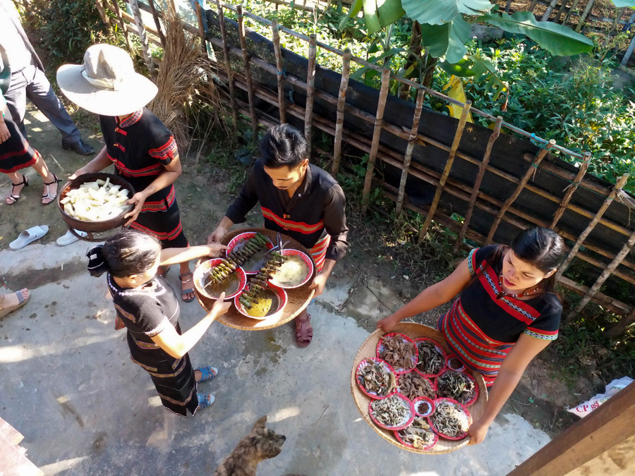 | Sau khi lễ vật được chuẩn bị đầy đủ ở nhà, người dân đưa đến nhà cộng đồng. |