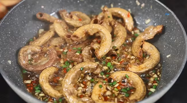 Bước 4: Cho lòng vào sốt, gần bắc ra cho hành lá vào đảo đều.