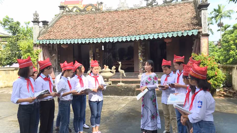 Cô Lê và học sinh trong một giờ học trải nghiệm thực tế tại Thái Bình