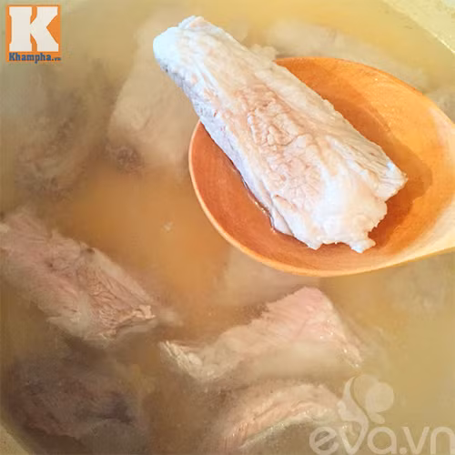 Bước 4: Sườn sau khi chần với nước sôi, cho vào nước ninh cho sườn chín nhừ. Sau đó cho măng đã xào vào nêm gia vị sao cho vừa miệng và đun tiếp khoảng 20 phút, cho măng sườn và gia vị hoà quyện cùng nhau.