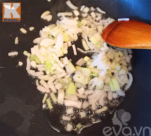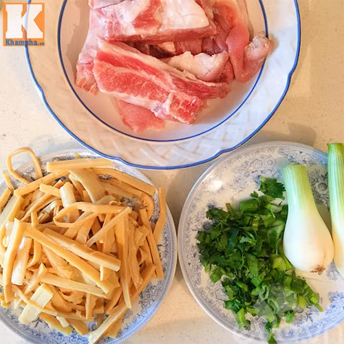 Bước 2: Măng ngâm qua nước muối và rửa sạch sau đó thái sợi nhỏ vừa phải. Hành và rau mùi thái chỉ nhỏ, hành củ thái hạt lựu sau đó cho lên chảo có dầu nóng rồi phi vàng.