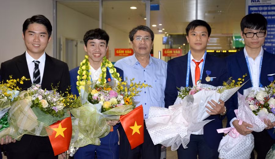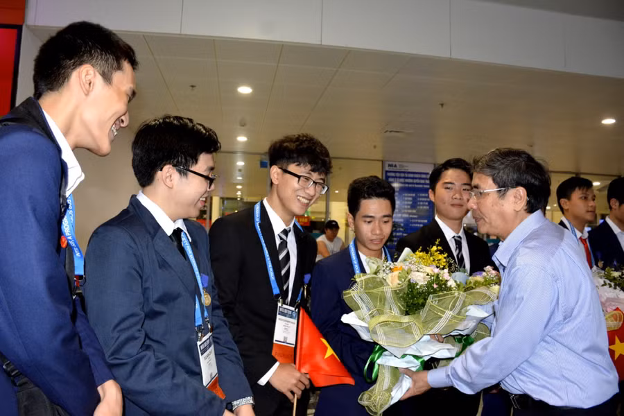 Đón và chúc mừng thành tích của đoàn tại sân bay Quốc tế Nội Bài có ông Vũ Đình Chuẩn- Vụ trưởng Vụ Giáo dục Trung học (Bộ GD&ĐT).